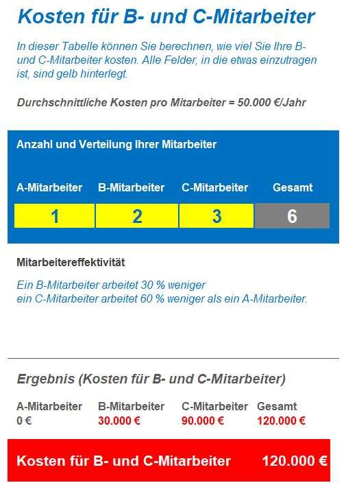 Laden Sie jetzt den ABC Kostenrechner herunter und erfahren Sie, wie viel Ihre B und C Mitarbeiter tatsächlich kosten.